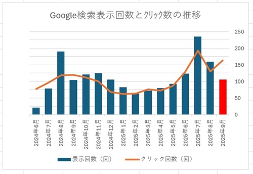 ただ、以下のグラフのように、8月、9月とGoogle検索による表示回数が減少しているのが気になるところです。